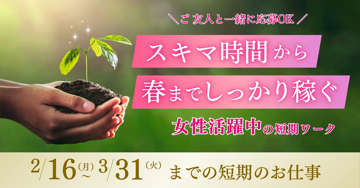 | 勤務時間 | 2月 平日 8:30-17:00(実働7時間) 3月 平日 8:00-17:30(実働8時間) 土曜 8:00-12:00(実働3.75時間) ※3月は繁忙期の為、土曜日午前中あり 就労期間:2026/2/17~3/31まで ※ご就業歴のある方は 2/16以前に就業開始も可能です。 ※早めの就業希望の場合は 2月1日からも相談可◎ |