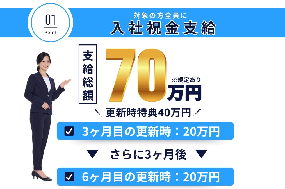 入社祝金70万円 【福利厚生】 1 有給休暇 祝金だけでなく、多数のレジャーやショップで使える割引会員サービス |