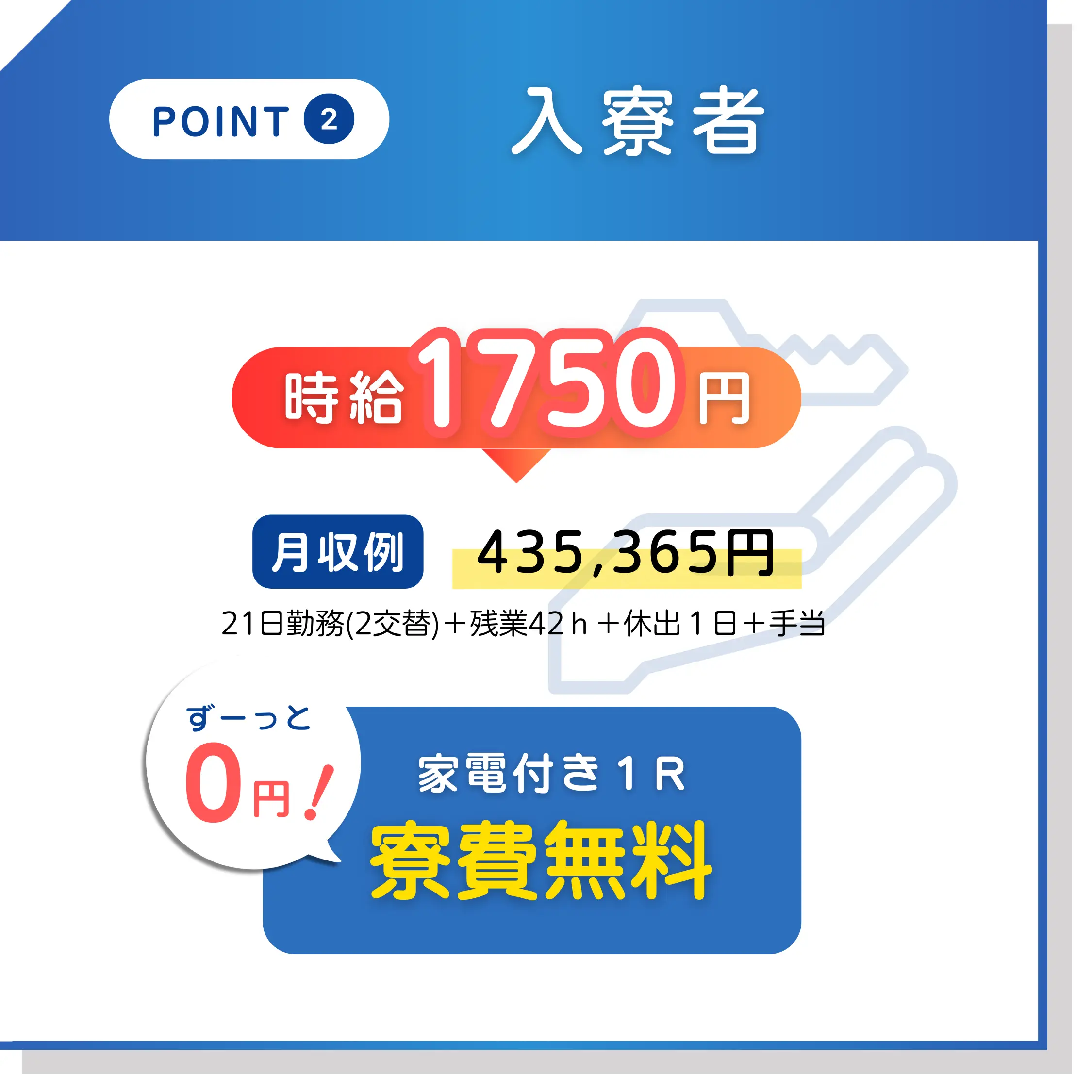高時給1,950円!(入寮者は1,750円)!【入寮の場合】寮費無料!しっかり働いてしっかり稼げます。