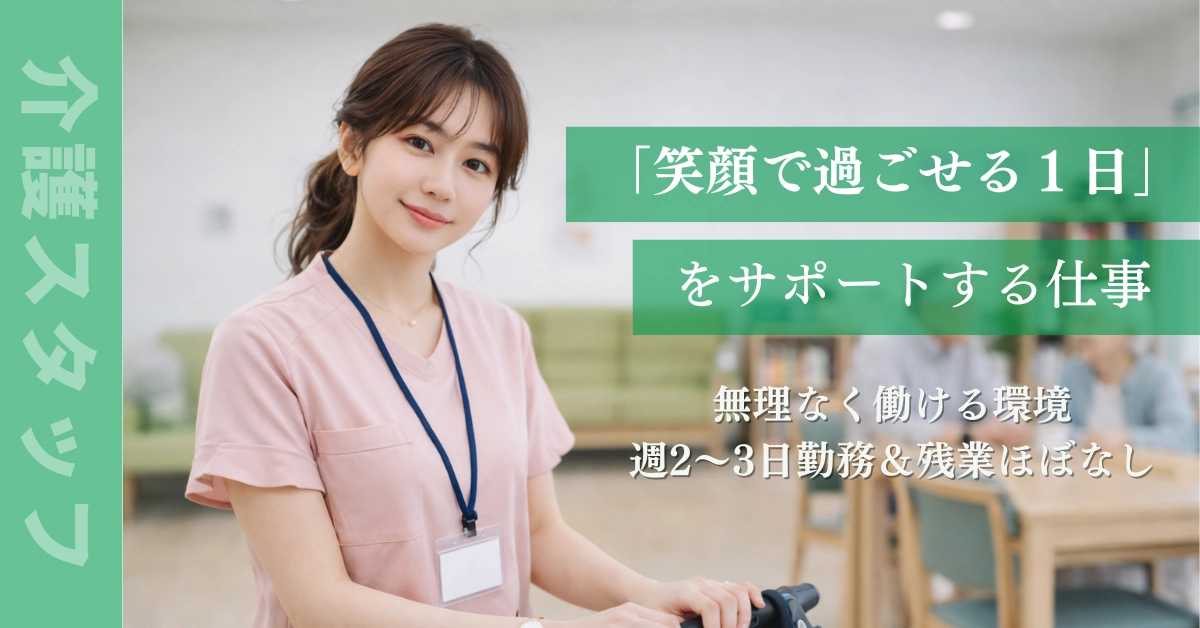| 仕事内容 | ■□■ 扶養内OK !! デイサービス介護スタッフ募集 ■□■ 「笑顔で過ごせる1日」をサポートするお仕事です !! 利用者の方が安心して過ごせるよう、あなたの優しさを活かしませんか ? ――――――――――――――――――――― 【仕事内容】 デイサービスセンターでの介護業務全般をお任せします ! ● 入浴・食事などの身の回りのサポート ● レクリエーションの企画・実施 ● 健康チェック・リハビリ補助 ● 送迎車への添乗 など < 1日の流れ > 午前 : 送迎対応(添乗)・入浴介助・昼食サポート 午後 : レクリエーション対応・リハビリ補助・片付け・翌日の準備 ――――――――――――――――――――― 【給与】 時給 1,300円 ~ 1,625円 └ 月収12万円以上可 (週2 ~ 3日勤務 / 月12日勤務の場合) ※残業代全額支給 ※特別時給割増あり(残業時・休日出勤時25%UP) ――――――――――――――――――――― 【勤務時間】 □ シフト制・休憩45分) ① 8:00 ~ 16:30 ② 9:00 ~ 17:30 ③ 9:30 ~ 18:00 ④ 7:45 ~ 16:15 └ 週2 ~ 3日勤務 / 週30時間未満 └ 残業ほぼナシ (残業時は全額支給) ――――――――――――――――――――― 【休日】 ■土日休み ■年次有給休暇 ■特別休暇 (会社カレンダーに準ずる) ――――――――――――――――――――― 【勤務地】 兵庫県伊丹市荒牧 JR福知山線「中山寺駅」 より バイク5分 ――――――――――――――――――――― 【応募資格】 □ 初任者研修 修了者 必須 □ 未経験OK・学歴不問 □ フリーター・主婦 (夫) 歓迎 ――――――――――――――――――――― 【待遇 (福利厚生)】 ■交通費全額支給 (規定あり) ■給与前払い制度あり ■子ども手当あり └ お子様おひとりにつき5,000円支給 ■特別時給割増制度あり ――――――――――――――――――――― 《ここがポイント》 〇 日勤のみ × 残業ほぼナシ → 無理なく働ける環境◎ 〇 週2 ~ 3日勤務で家庭やプライベートとも両立OK 〇 ブランクのある方・介護経験が浅い方も安心サポート体制あり ――――――――――――――――――――― 人に寄り添う気持ちを大切にできる方、大歓迎です。 見学だけでもOK ! まずはお気軽にお問い合わせください !! |
