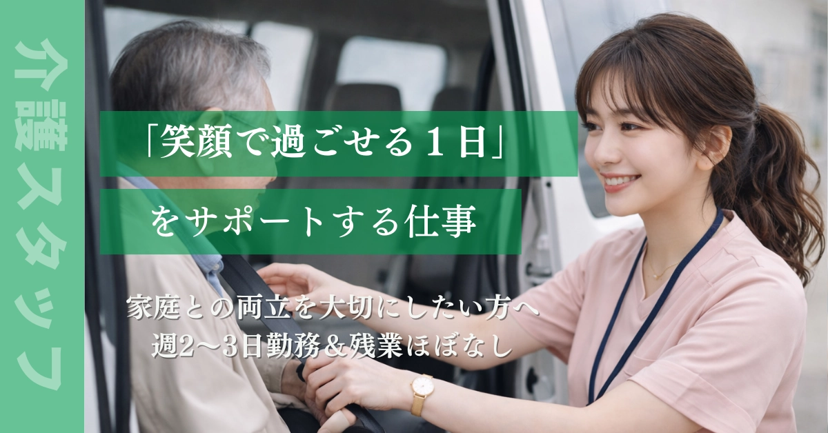 | 仕事内容 | ■□■ 未経験・扶養内OK ! デイサービス介護スタッフ募集 ■□■ 「家庭との両立を大切にしたい方へ」 週2 ~ 3日の勤務で無理なく働ける環境◎ 介護福祉士の資格を活かして、笑顔あふれるデイサービスで活躍しませんか ? ――――――――――――――――――――― 【仕事内容】 デイサービスセンターにて利用者様の介護業務全般をお任せします ! 〇 入浴・食事など身の回りのお世話 〇 レクリエーションの企画・実施 〇 健康チェック・リハビリ補助 〇 送迎車への添乗 (お迎え・送り) └ 午前 : 送迎添乗・入浴介助・昼食対応 └ 午後 : レクリエーション対応・リハビリ補助・送迎準備・片付け ――――――――――――――――――――― 【給与】 時給 1,450円 ~ 1,813円 月収例 : 13万円以上可能 (月12日勤務の場合) ■特別時給割増 残業時25%UP / 休日出勤時25%UP 【勤務時間】 シフト制 (週2 ~ 3日勤務 / 週30時間未満) ① 8:00 ~ 16:30 ② 9:00 ~ 17:30 ③ 9:30 ~ 18:00 ④ 7:45 ~ 16:15 ※各シフト休憩45分 ※残業ほぼ無し (発生時は全額支給) 【休日・休暇】 ■土日休み ■年次有給休暇 ■特別休暇 ※会社カレンダーによる 【勤務地】 兵庫県伊丹市荒牧 JR福知山線「中山寺駅」 より バイク5分 ――――――――――――――――――――― 【応募資格】 □ 介護福祉士 必須 □ 未経験OK / 学歴不問 □ フリーター・主婦 (夫) 歓迎 ――――――――――――――――――――― 【待遇 (福利厚生)】 ■交通費全額支給 (規定あり) ■給与前払い制度あり ■子ども手当 (お子様1人につき5,000円支給) ――――――――――――――――――――― 【ここがPOINT ! 】 〇 扶養内勤務で家庭と両立しやすい ! 〇 残業ほぼナシでプライベート充実◎ 〇 アットホームな職場でブランクがあっても安心 !! |