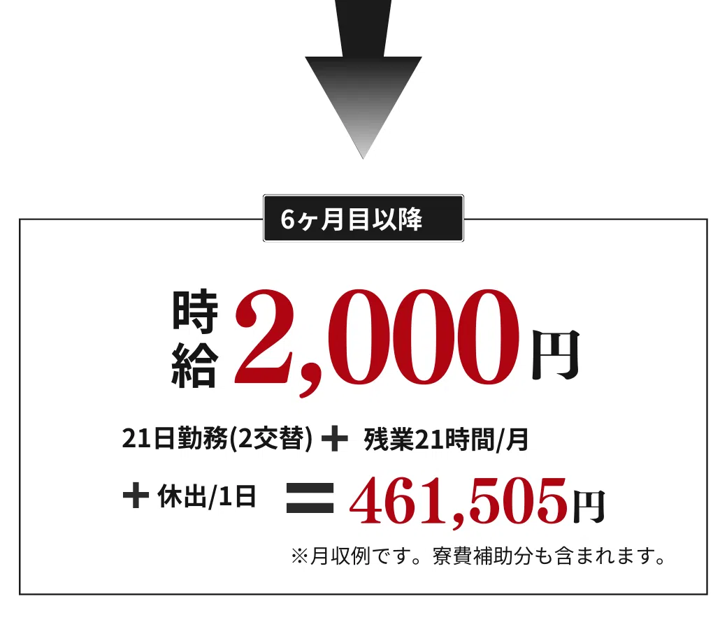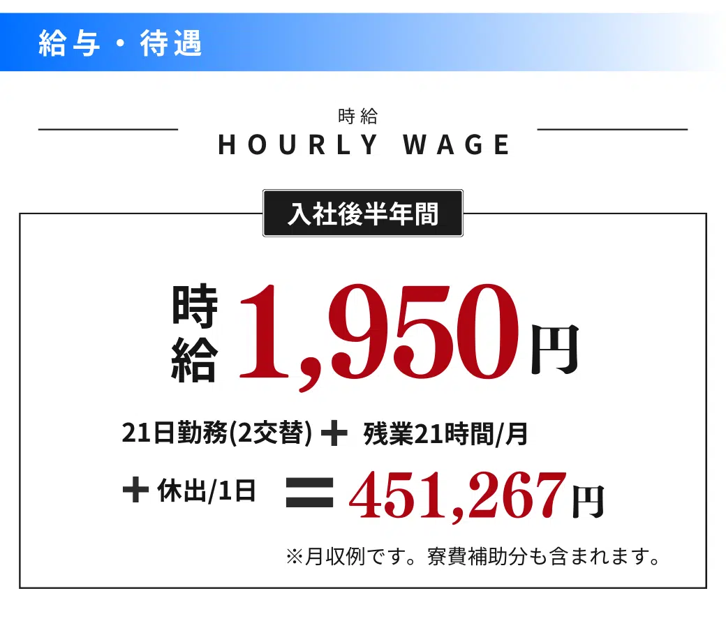 (注)半年経過後の時給2,000円への昇給対象は、いなべ工場のみです(吉原・富士松工場は時給1,900円)。