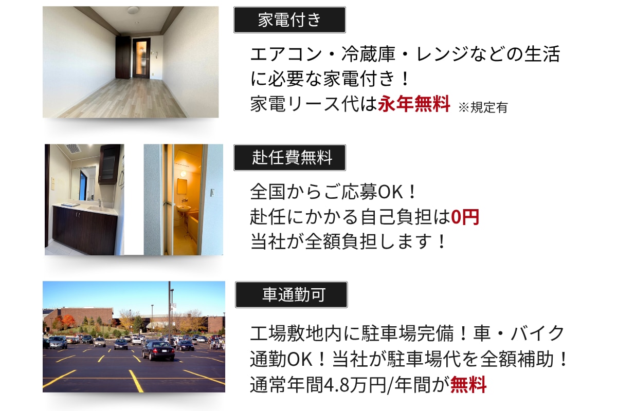 | 待遇 | 【高待遇】 ◎入社祝金:50万円支給 ◎おもてなしパック支給 15,000円分の生活支援品をお渡しできます(給与天引き) ◎家具家電製品完備1R完備 キレイなワンルームの社員寮を完全無料で、ご用意いたします。 ◎無料駐車場完備で車・バイク通勤可能 ◎赴任費支給 赴任の際の交通費も全額支給致します。 ◎無料送迎バス利用可能 ※工場迄は片道10~20分 ◎個人ロッカーの貸し出しあり。 ◎工場内にはカフェテリア方式で好きなものが食べられる食堂があります。 【福利厚生】 ◎共済会制度 毎月の掛け金が1,000円で入れる当社の手厚い保険制度です。 もちろん入会は自由です。 |