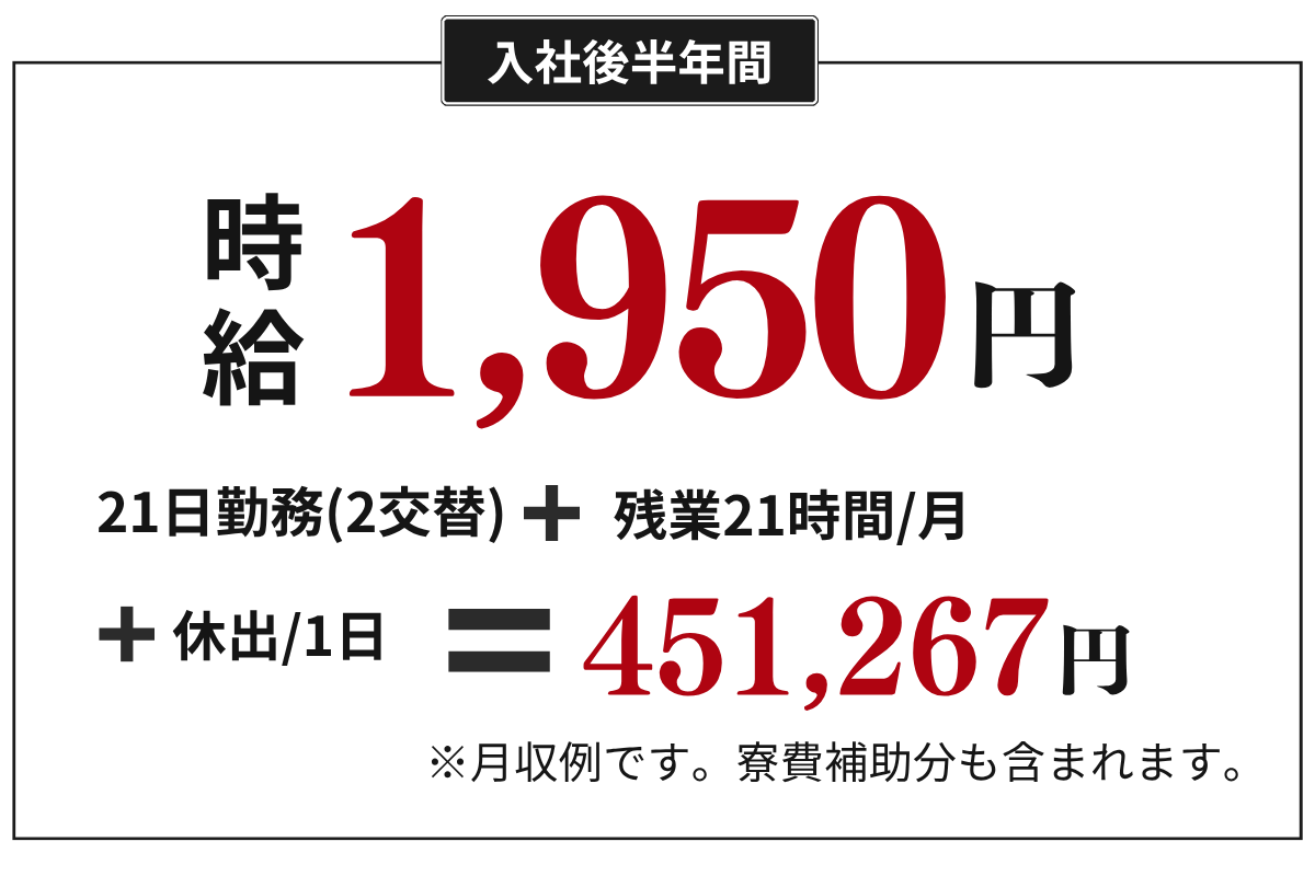※いなべ工場は時給1,950円、半年経過後は時給2,000円への昇給対象です。吉原工場・富士松工場の時給は1,900円です。