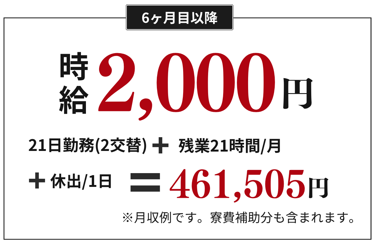 ※寮費6万円・光熱費1.5万円・初期費用35万円の想定です。条件により変動します。
