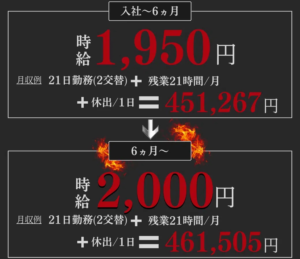時給 1,950円 ~ 半年経過後は時給2000円に昇給!(いなべ工場のみ) 【月収例】 月収例②※残業なしの場合 ※残業代、休日出勤・手当て込みの概算 |