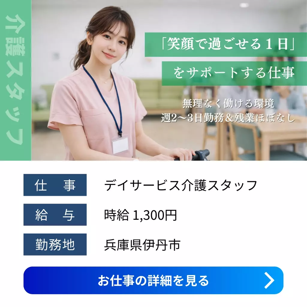 【兵庫県伊丹市】デイサービス介護スタッフ募集|週2〜3日勤務×扶養内OK×日勤のみ兵庫県1300円以上1200円以上求人未経験者歓迎経験者歓迎シフト制家族手当転勤なし交通費支給有給休暇土日休み社会保険派遣加古川オフィス伊丹市介護・福祉2026-01-21 06:59