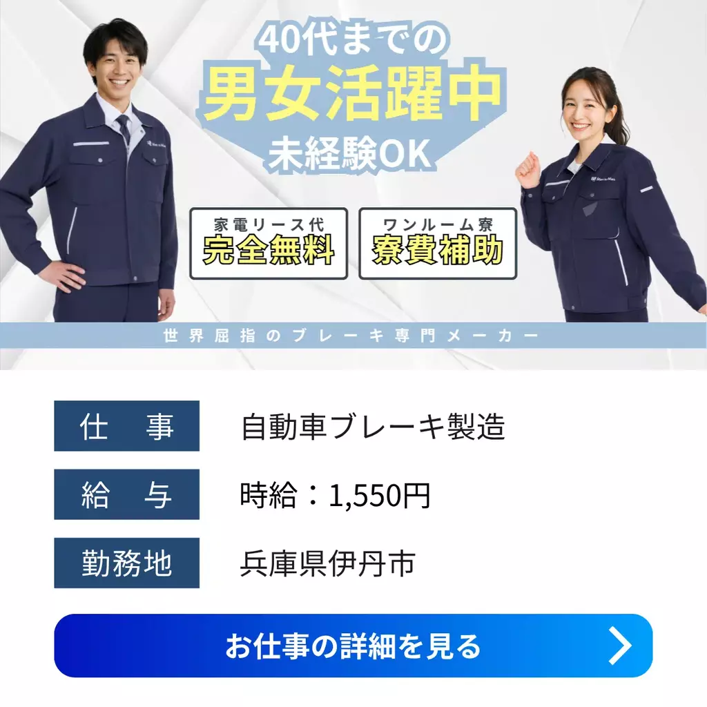 【兵庫県伊丹市】高収入実現!手のひらサイズの車用ブレーキ製造組立加工兵庫県1500円以上1400円以上1300円以上1200円以上寮費補助正社員登用制度高時給製造工場求人入寮未経験者歓迎経験不問ブランクOK家族手当交通費支給有給休暇土日休み資格不要社会保険住宅手当女性活躍中男性活躍中寮付き家電付き寮1R派遣高収入住み込みピックアップ大阪オフィス伊丹市待機寮2025-03-18 05:52