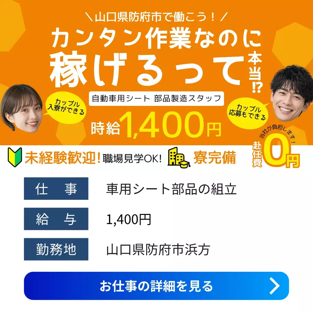 【山口県防府市】時給1400円|車のシートの製造組立運搬1400円以上1300円以上1200円以上高時給製造工場1100円以上山口県求人防府市未経験者歓迎中高年経験不問経験者歓迎家族手当転勤なし土日休み社会保険住宅手当派遣高収入副業OK広島オフィス2025-03-18 06:26