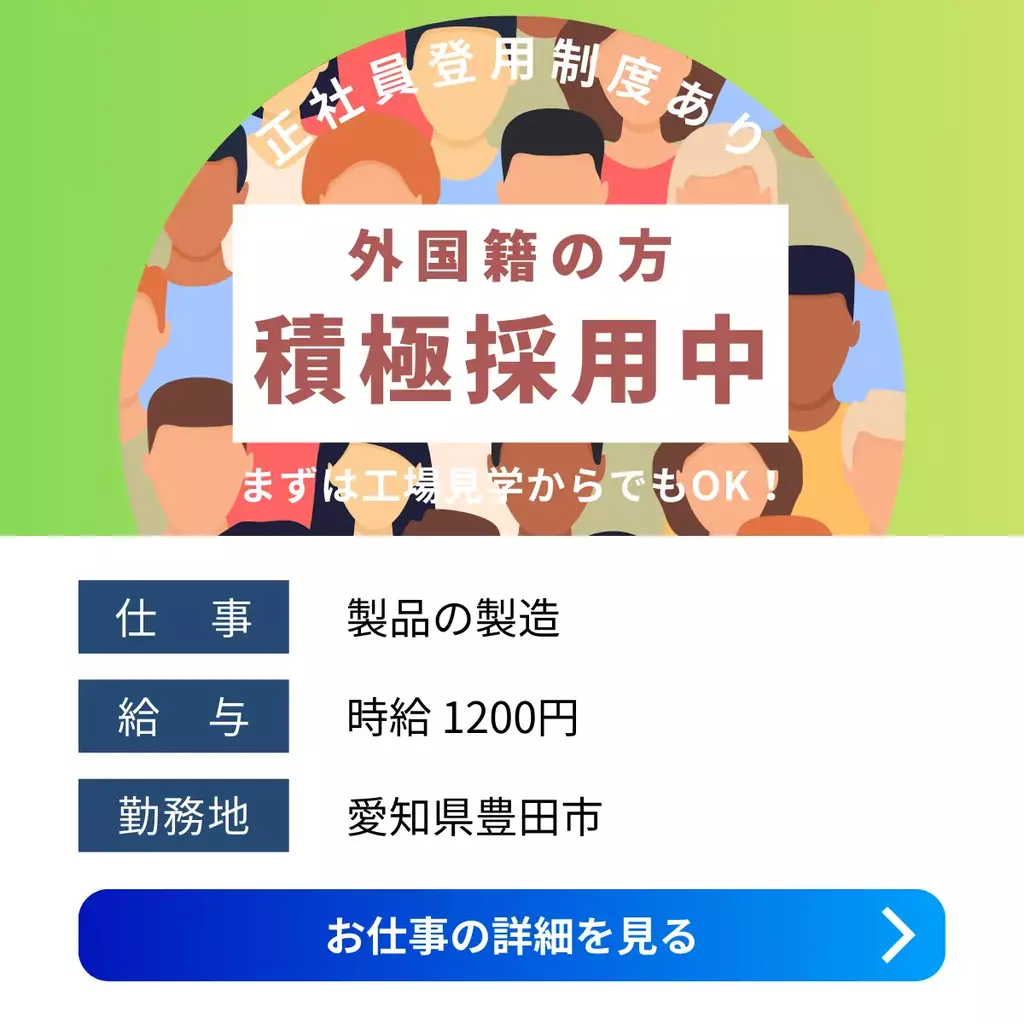 【愛知県豊田市】製造求人|未経験OK・外国籍活躍|時給1,200~1,500円・車通勤可愛知県1200円以上寮費補助正社員登用制度製造工場求人未経験者歓迎経験不問ブランクOK家族手当交通費支給有給休暇土日休み工場内作業社員食堂あり資格不要社会保険女性活躍中男性活躍中寮付き家電付き寮1R派遣住み込み三河オフィス豊田市待機寮2025-12-10 05:21