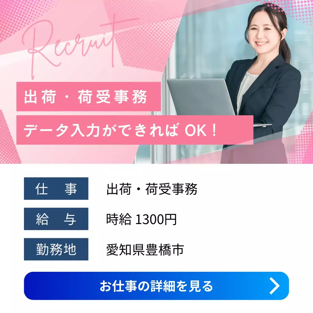 【愛知県豊橋市】出荷・荷受事務|未経験OK・日勤のみ・土日祝休み愛知県求人事務未経験者歓迎経験不問経験者歓迎ブランクOK家族手当交通費支給有給休暇昼勤(日勤)土日祝休み社会保険残業なし・少なめ主婦・主夫歓迎女性活躍中派遣浜松オフィス豊橋市2025-12-24 00:52