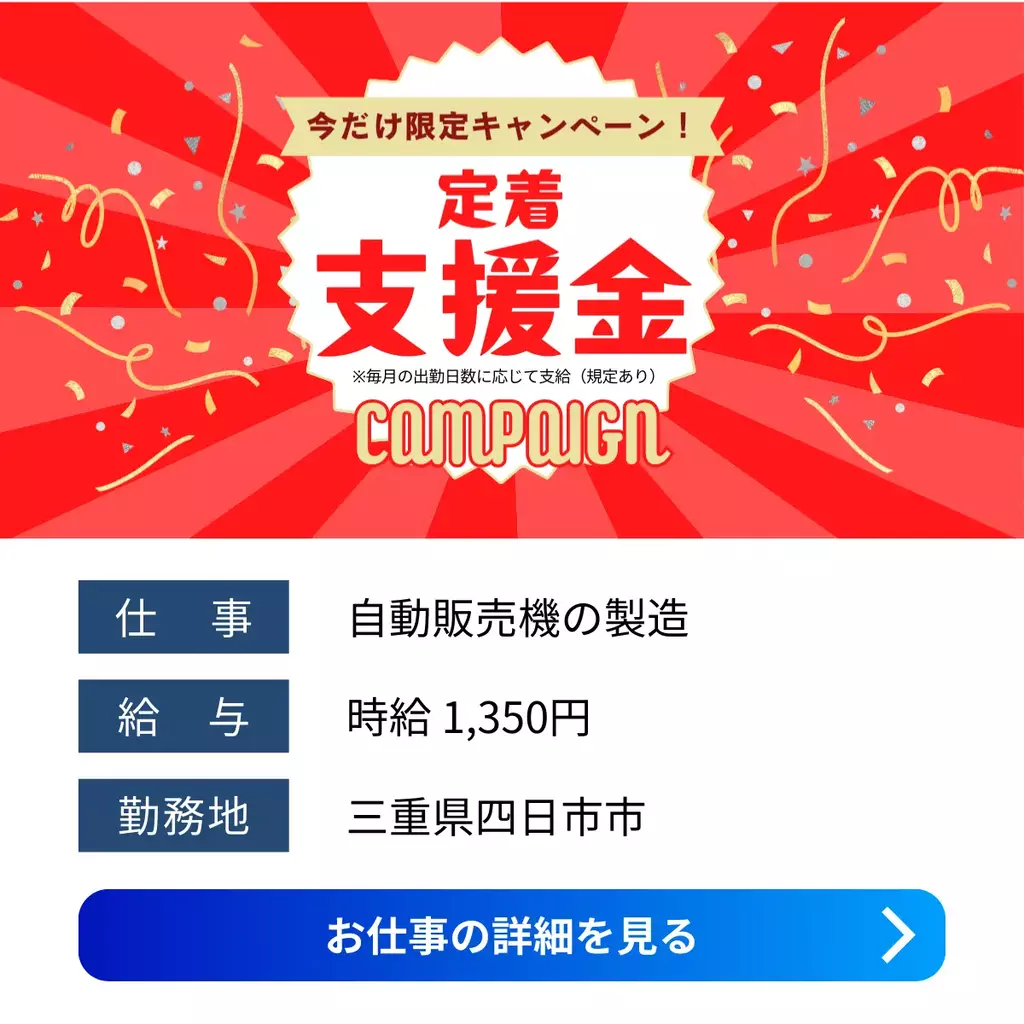 【三重県四日市市】自販機製造スタッフ募集|家電付き寮完備×未経験OK×土日祝休み組立加工三重県運搬1300円以上1200円以上製造工場求人四日市市未経験者歓迎家族手当転勤なし交通費支給工場内作業資格不要土日祝休み社会保険寮付き家電付き寮1R派遣四日市オフィス梱包2025-12-25 01:00