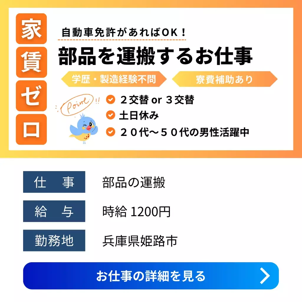 【兵庫県姫路市】未経験OKの工場内運搬作業|寮完備・月収28万円可寮費無料兵庫県運搬1200円以上寮費補助製造工場求人シニア活躍中未経験者歓迎中高年経験不問家族手当交通費支給有給休暇土日休み工場内作業社員食堂あり社会保険男性活躍中寮付き家電付き寮1R派遣住み込み加古川オフィス姫路市2025-12-25 00:14