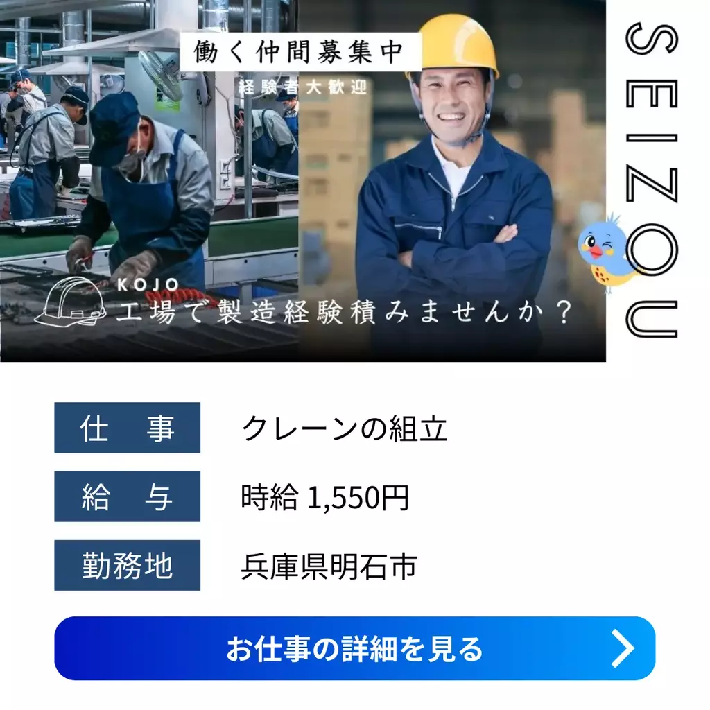 【兵庫県明石市】クレーン製造の組立スタッフ募集|日勤×高時給1550円×土日祝休み組立兵庫県運搬1500円以上1400円以上1300円以上1200円以上正社員登用制度高時給工場求人家族手当交通費支給土日祝休み社会保険寮付き家電付き寮1R派遣高収入加古川オフィス明石市2025-12-25 02:30