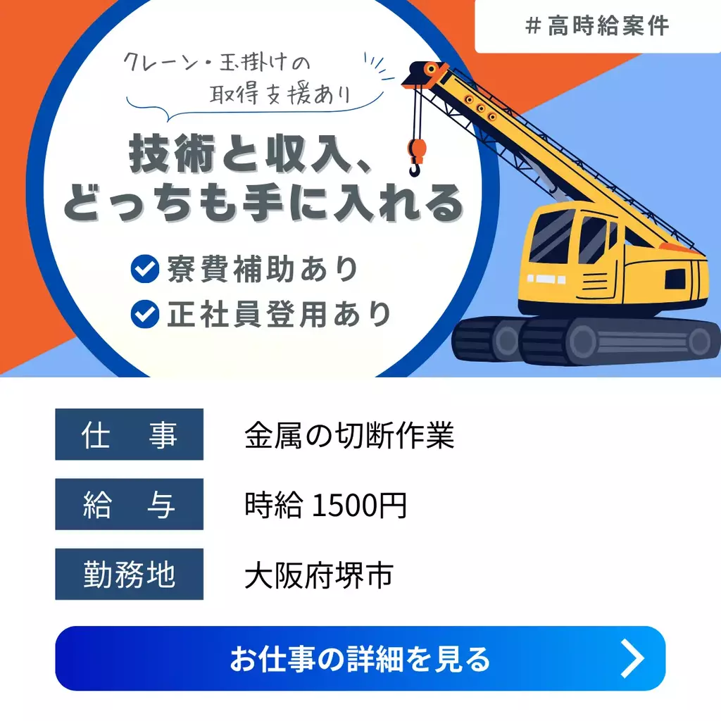 【大阪府堺市】玉掛・クレーン作業|未経験歓迎|資格取得支援あり|日勤専属大阪府運搬1500円以上1400円以上1300円以上1200円以上寮費補助製造工場求人未経験者歓迎経験者歓迎ブランクOK家族手当交通費支給有給休暇昼勤(日勤)土日祝休み社会保険主婦・主夫歓迎男性活躍中寮付き家電付き寮1R派遣住み込み資格取得可能大阪オフィス堺市2025-12-25 07:49