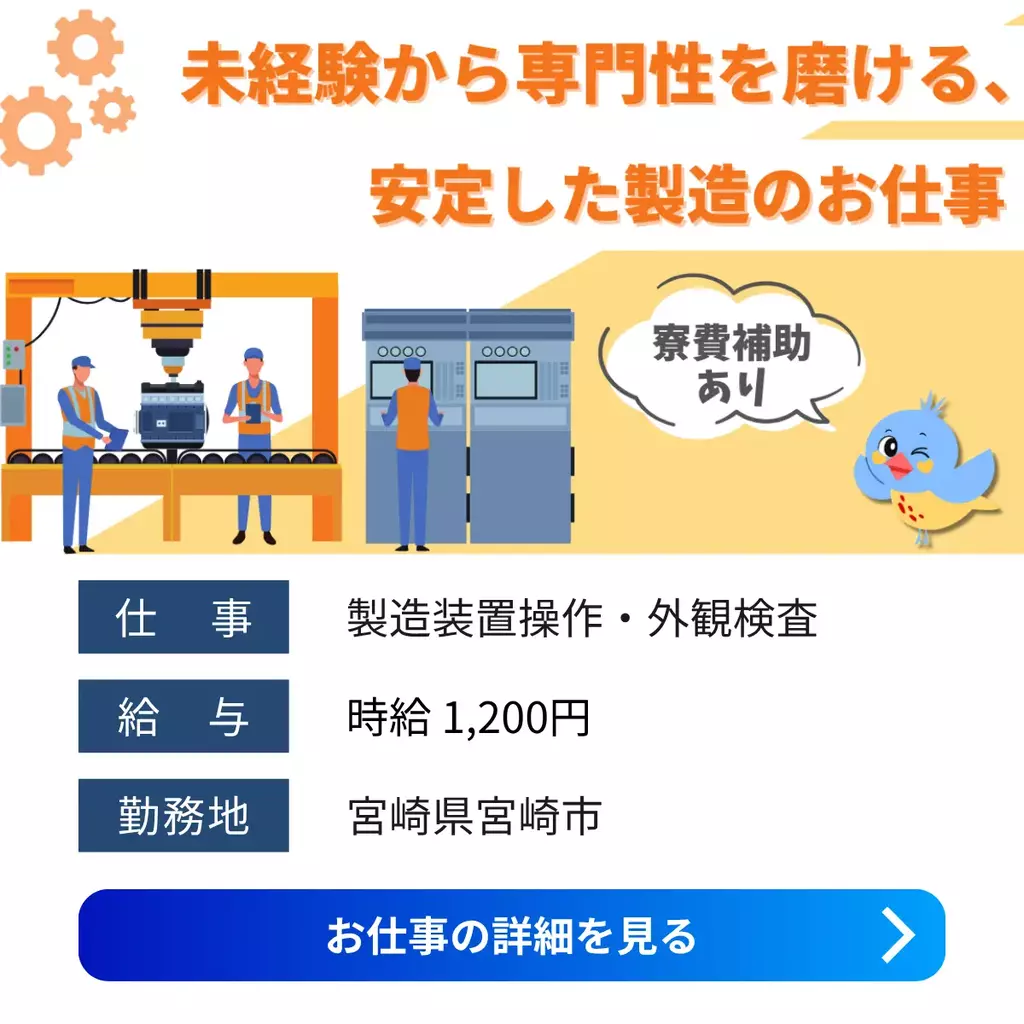 【宮崎県宮崎市】水晶振動子製造スタッフ募集中|時給1200円|未経験OK&高待遇1200円以上正社員登用制度検査製造工場1100円以上求人宮崎県シニア活躍中未経験者歓迎中高年経験不問経験者歓迎ブランクOK家族手当交通費支給有給休暇夜勤工場内作業資格不要社会保険残業なし・少なめ主婦・主夫歓迎女性活躍中男性活躍中寮付き家電付き寮派遣住み込み1000円以上友達と働くカップルで働く宮崎市待機寮2025-03-24 02:50