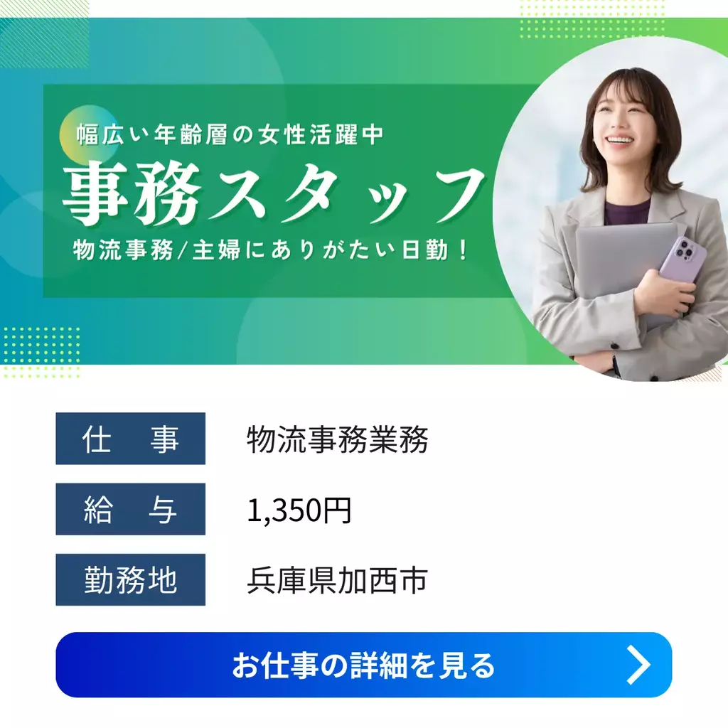 【兵庫県加西市】物流事務|時給1,350円~1,688円|日勤・主婦活躍中兵庫県1300円以上製造工場求人事務シニア活躍中経験者歓迎シフト制家族手当昼勤(日勤)工場内作業資格不要社会保険女性活躍中家電付き寮1R派遣加古川オフィス加西市2025-03-18 05:53