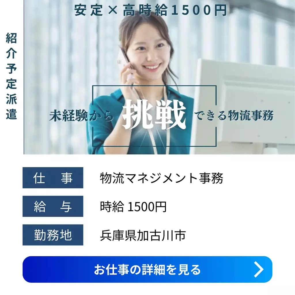 【兵庫県加古川市】未経験OKの物流マネジメント事務|土日祝休み・高時給1,500円兵庫県1500円以上1400円以上1300円以上1200円以上正社員登用制度求人事務未経験者歓迎経験不問家族手当交通費支給有給休暇昼勤(日勤)社員食堂あり資格不要土日祝休み社会保険主婦・主夫歓迎女性活躍中男性活躍中派遣加古川オフィス加古川市2025-12-08 05:04