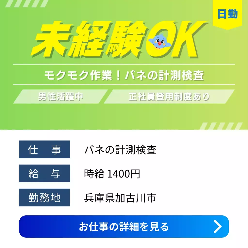 【兵庫県加古川市】未経験OKの精密バネ仕上げスタッフ募集|日勤×土日休み|高時給1,400円兵庫県1400円以上1300円以上1200円以上正社員登用制度機械オペレーター検査製造工場求人未経験者歓迎経験不問家族手当交通費支給有給休暇土日休み昼勤(日勤)工場内作業社員食堂あり資格不要社会保険主婦・主夫歓迎男性活躍中派遣加古川オフィス加古川市2025-12-08 06:24