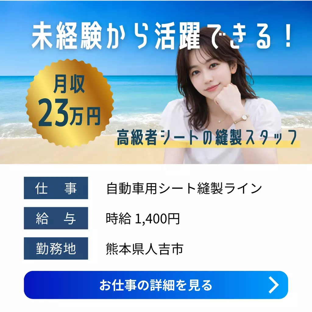 【熊本県人吉市】高級車シートの縫製オペレーター募集|未経験OK×研修充実×手に職1400円以上1300円以上1200円以上高時給製造工場求人未経験者歓迎経験不問経験者歓迎家族手当転勤なし土日休み軽作業工場内作業資格不要社会保険女性活躍中派遣高収入宮崎オフィス熊本県人吉市2026-01-21 01:50