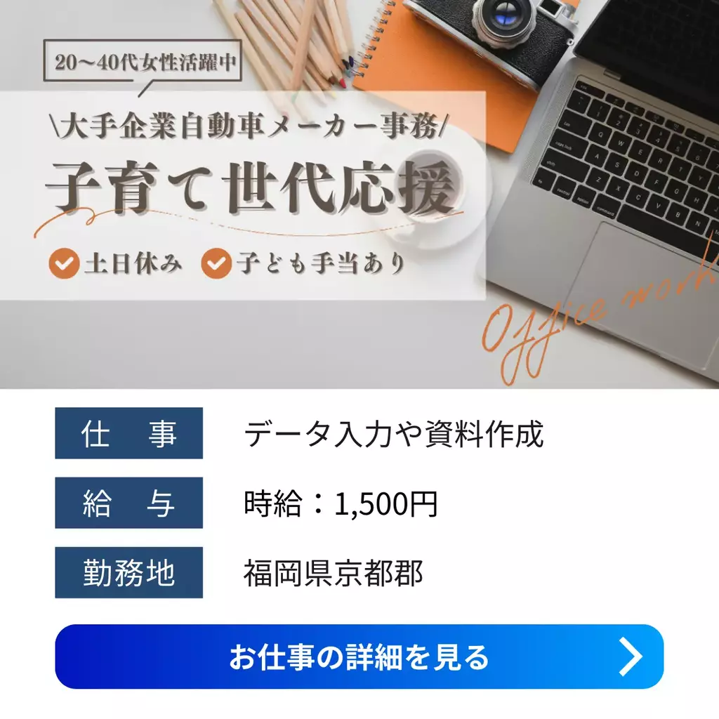 【福岡県京都郡】事務職求人|髪色・ネイルOK&スキルが身につく仕事1500円以上1400円以上1300円以上1200円以上福岡県高時給求人事務経験者歓迎家族手当交通費支給有給休暇土日休み昼勤(日勤)社員食堂あり資格不要社会保険女性活躍中派遣北九州オフィス京都郡2025-05-27 07:25