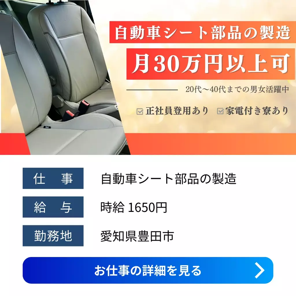 【愛知県豊田市】自動車カーペット製造スタッフ求人|未経験歓迎・寮費半額補助|時給1500円加工愛知県運搬1500円以上1400円以上1300円以上1200円以上寮費補助正社員登用制度検査製造工場求人未経験者歓迎経験不問ブランクOK家族手当交通費支給有給休暇土日休み工場内作業社員食堂あり資格不要社会保険女性活躍中男性活躍中寮付き家電付き寮1R派遣住み込み三河オフィス豊田市待機寮2025-12-10 04:41