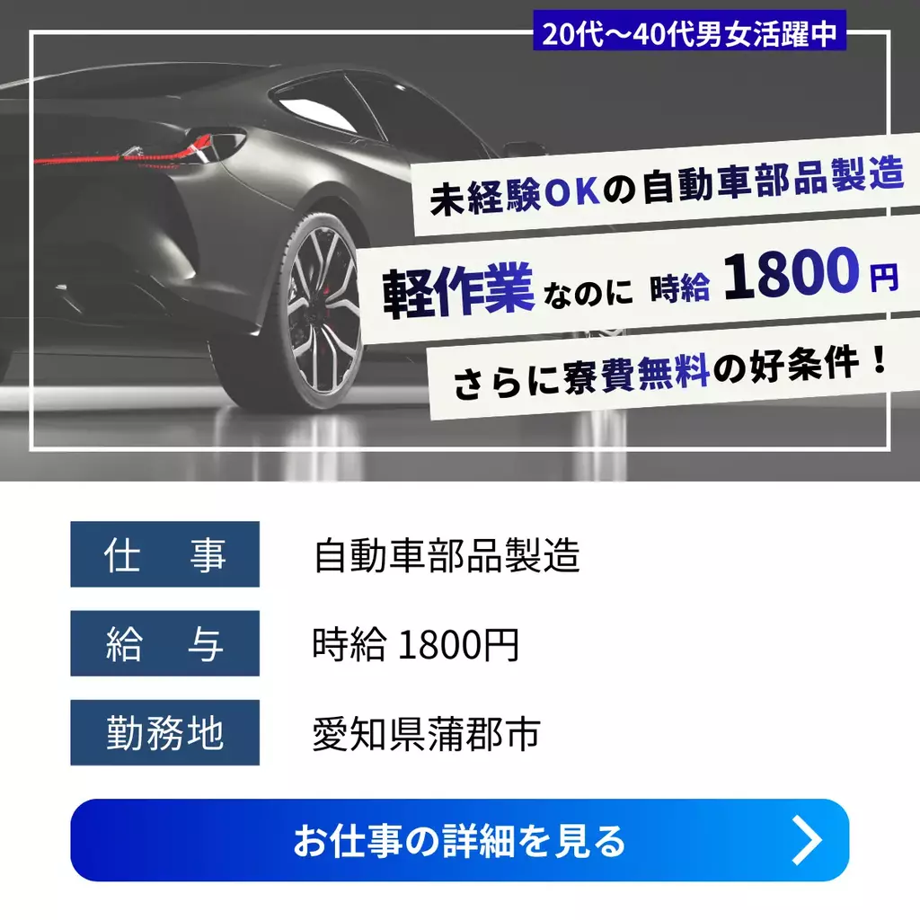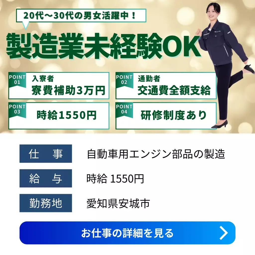 【愛知県安城市】自動車部品の組立・加工・検査スタッフ|高時給&寮完備|未経験歓迎組立加工愛知県1500円以上1400円以上1300円以上1200円以上寮費補助検査製造工場求人未経験者歓迎経験不問ブランクOK家族手当交通費支給有給休暇土日休み工場内作業社員食堂あり資格不要社会保険女性活躍中男性活躍中寮付き家電付き寮1R派遣住み込み三河オフィス安城市待機寮2025-12-11 01:44