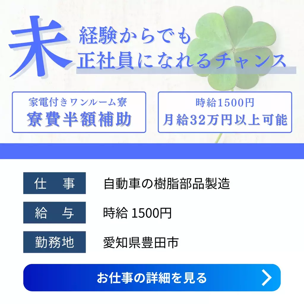 【愛知県豊田市】寮付き×高時給1500円|自動車部品の組立・供給スタッフ募集|未経験OK組立愛知県1500円以上1400円以上1300円以上1200円以上寮費補助正社員登用制度製造工場求人未経験者歓迎経験不問ブランクOK家族手当交通費支給有給休暇土日休み工場内作業社員食堂あり資格不要社会保険住宅手当女性活躍中男性活躍中寮付き家電付き寮1R派遣住み込み三河オフィス豊田市待機寮2025-12-11 03:12