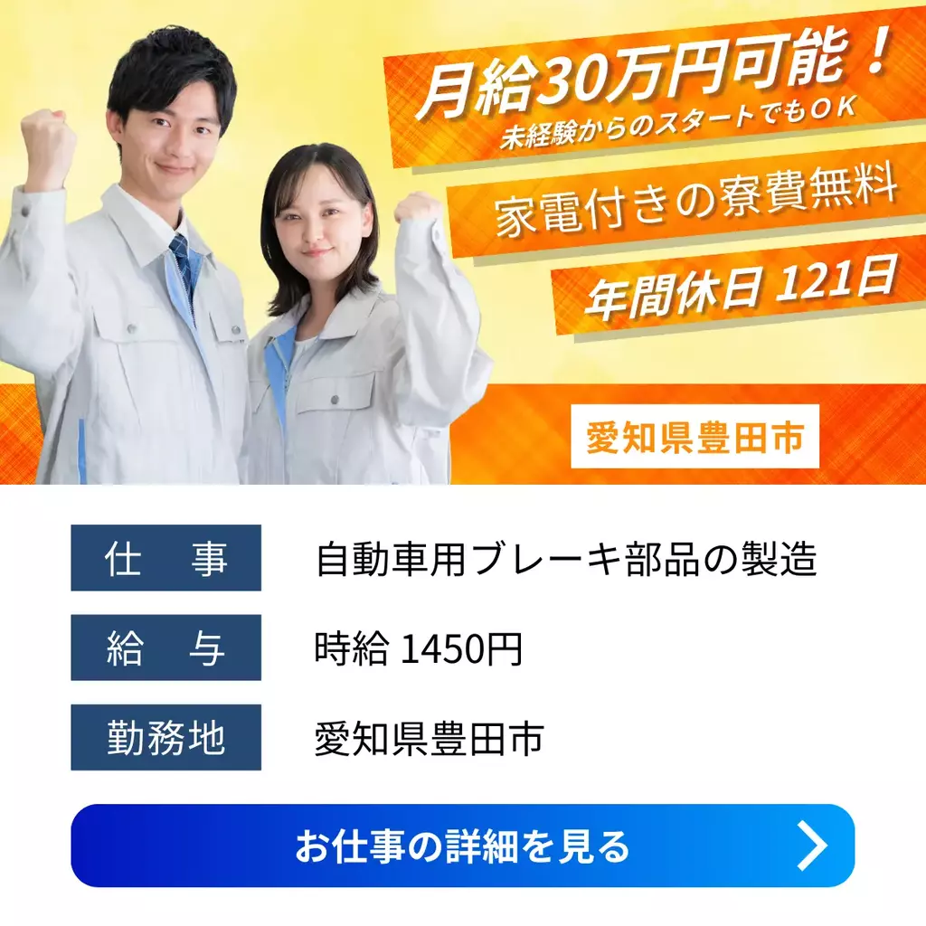 【愛知県豊田市】寮費無料の1Rアパート完備│自動車ブレーキ部品製造スタッフ募集|未経験歓迎組立愛知県寮費無料運搬1400円以上1300円以上1200円以上正社員登用制度検査製造工場求人未経験者歓迎経験不問ブランクOK家族手当交通費支給有給休暇土日休み工場内作業資格不要社会保険女性活躍中男性活躍中寮付き家電付き寮1R派遣住み込み三河オフィス豊田市待機寮2025-12-11 06:28