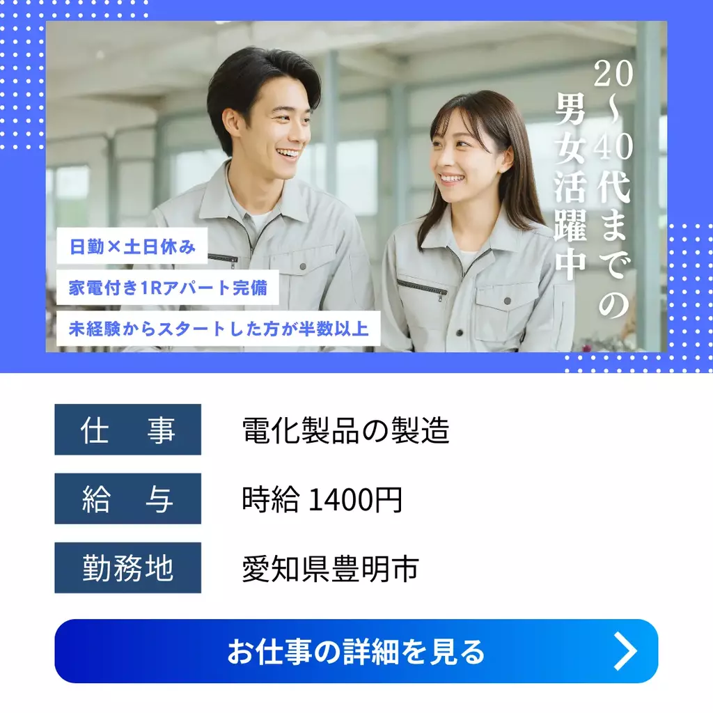 【愛知県豊田市】製造求人|未経験OK・外国籍活躍|時給1,200~1,500円・車通勤可愛知県1200円以上寮費補助正社員登用制度製造工場求人未経験者歓迎経験不問ブランクOK家族手当交通費支給有給休暇土日休み工場内作業社員食堂あり資格不要社会保険女性活躍中男性活躍中寮付き家電付き寮1R派遣住み込み三河オフィス豊田市待機寮2025-12-10 05:21