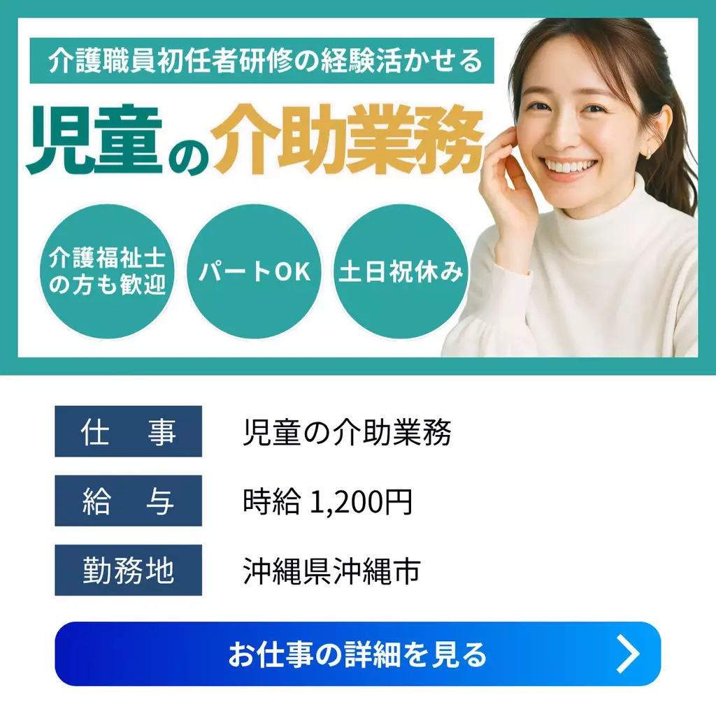 【沖縄県沖縄市】児童の介助業務 | 介護初任者研修修了者歓迎1300円以上1200円以上手当有高時給1100円以上求人経験者歓迎ブランクOK家族手当交通費支給有給休暇昼勤(日勤)土日祝休み社会保険残業なし・少なめ主婦・主夫歓迎女性活躍中男性活躍中派遣介護・福祉沖縄県沖縄オフィス沖縄市2025-11-19 06:29