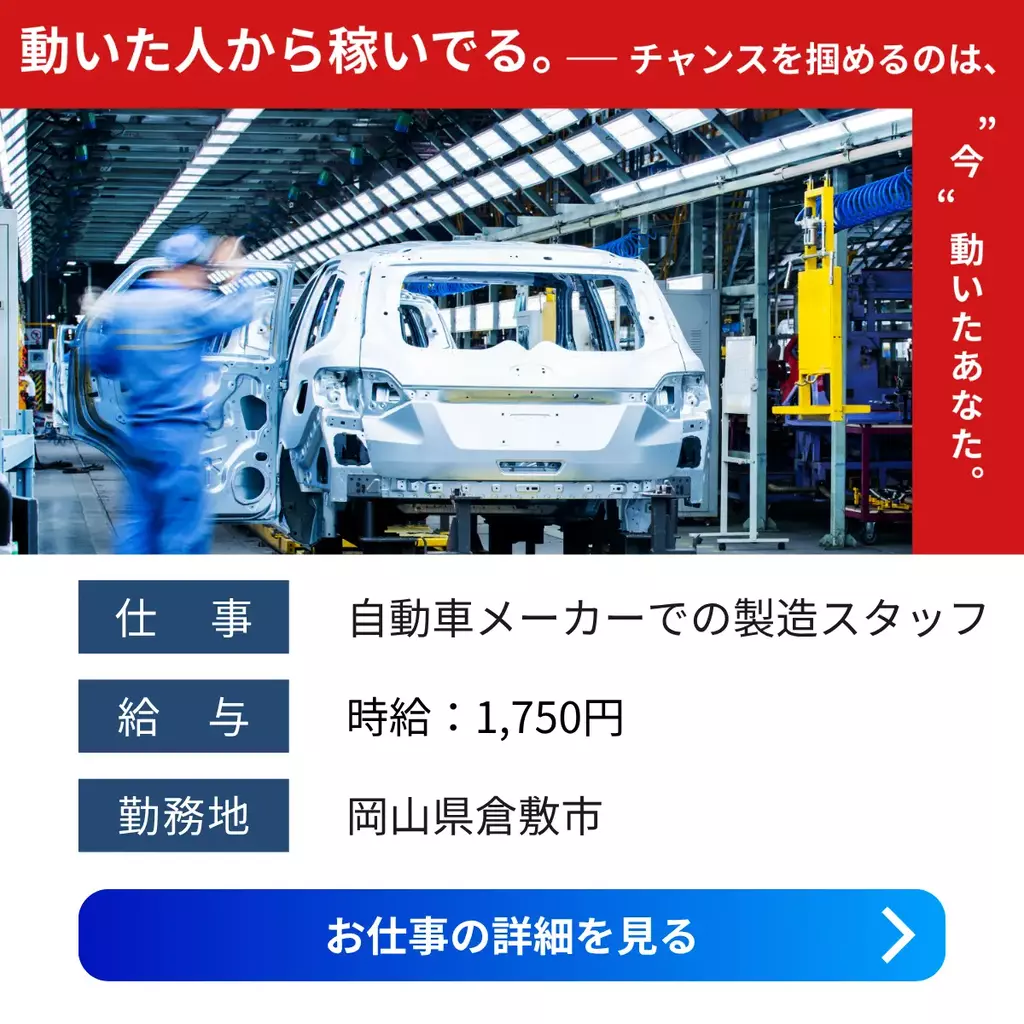 【岡山県倉敷市】高収入求人|寮費無料×月収48.9万円以上×年間休日120日組立寮費無料岡山県1600円以上1500円以上1400円以上1300円以上1200円以上手当有1700円以上正社員登用制度検査高時給製造求人倉敷市未経験者歓迎経験不問経験者歓迎家族手当交通費支給土日休み資格不要社会保険男性活躍中寮付き1R派遣高収入住み込み岡山オフィス2025-06-27 06:49