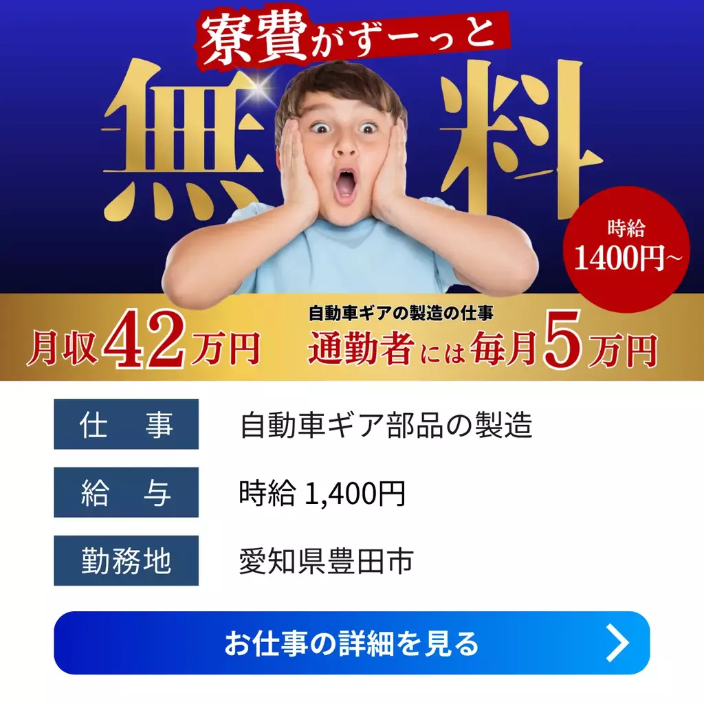 【愛知県豊田市】月収40万円以上&正社員!大手自動車メーカー勤務!組立愛知県寮費無料運搬1500円以上1400円以上1300円以上1200円以上手当有寮費補助入社祝金検査製造工場求人未経験者歓迎経験不問経験者歓迎ブランクOK家族手当交通費支給有給休暇土日休み工場内作業社員食堂あり資格不要社会保険住宅手当主婦・主夫歓迎女性活躍中男性活躍中寮付き1R派遣高収入住み込み三河オフィス豊田市待機寮2025-03-26 01:16