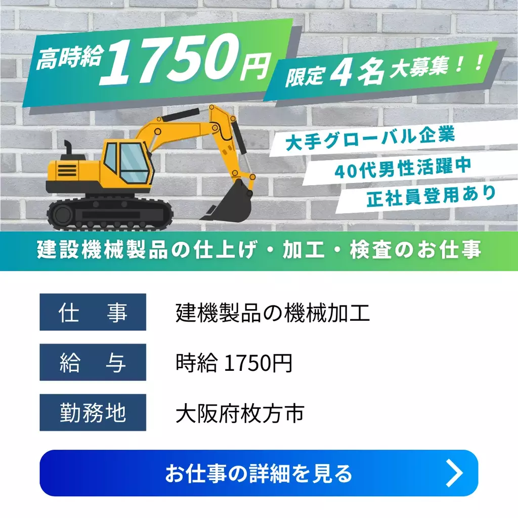 【大阪府枚方市】未経験歓迎|高時給1750円|建機部品の仕上げ・加工・検査加工大阪府1600円以上1500円以上1400円以上1300円以上1200円以上1700円以上正社員登用制度検査製造工場求人未経験者歓迎経験不問シフト制工場内作業社員食堂あり資格不要男性活躍中派遣大阪オフィス枚方市2025-12-25 02:01