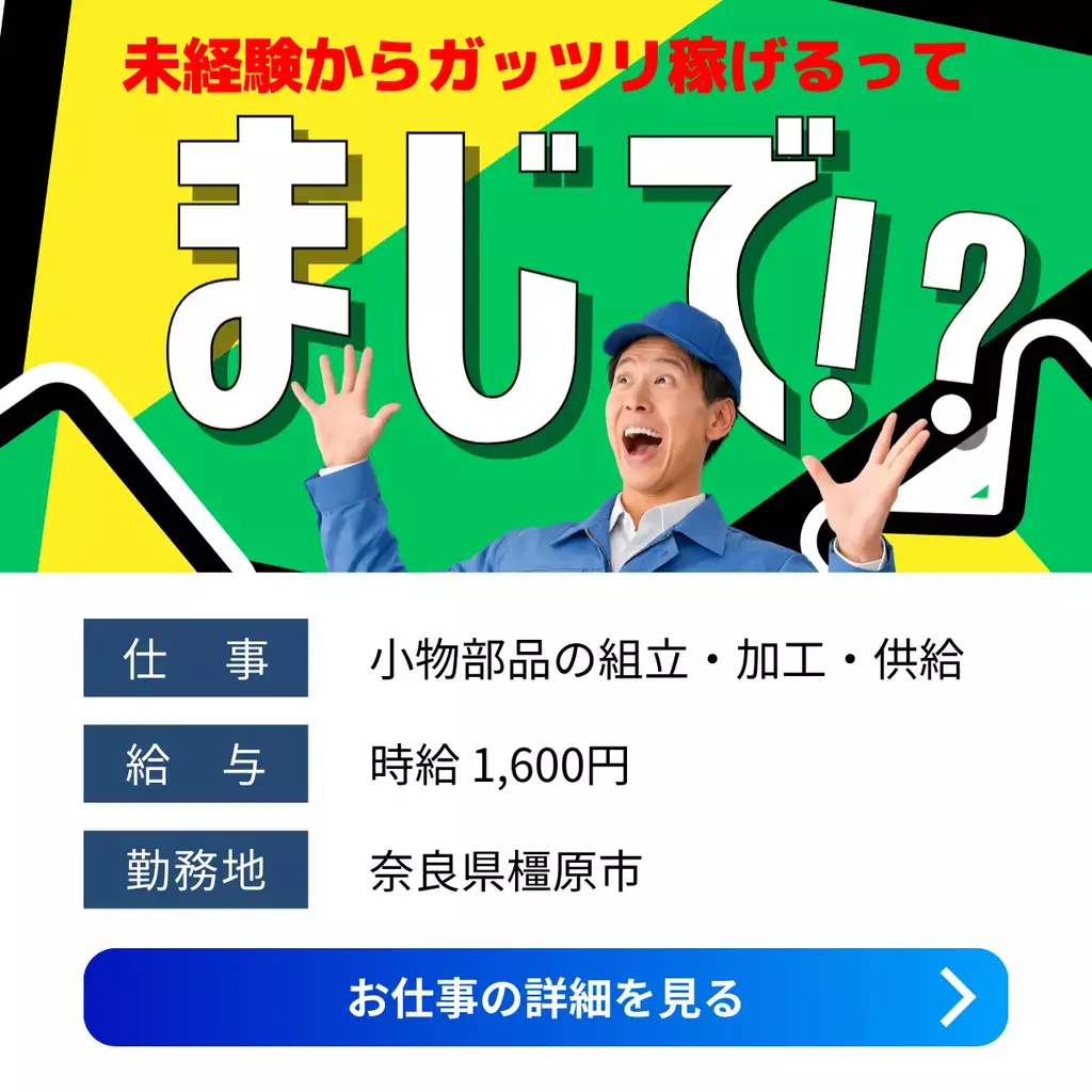 【奈良県橿原市】小物部品の組立・加工スタッフ募集|未経験OK×月収34万円以上可組立加工1600円以上1500円以上1400円以上1300円以上1200円以上正社員登用制度高時給製造工場求人奈良県未経験者歓迎経験者歓迎家族手当転勤なし土日休み社会保険派遣高収入大阪オフィスピッキング橿原市2025-12-25 05:41