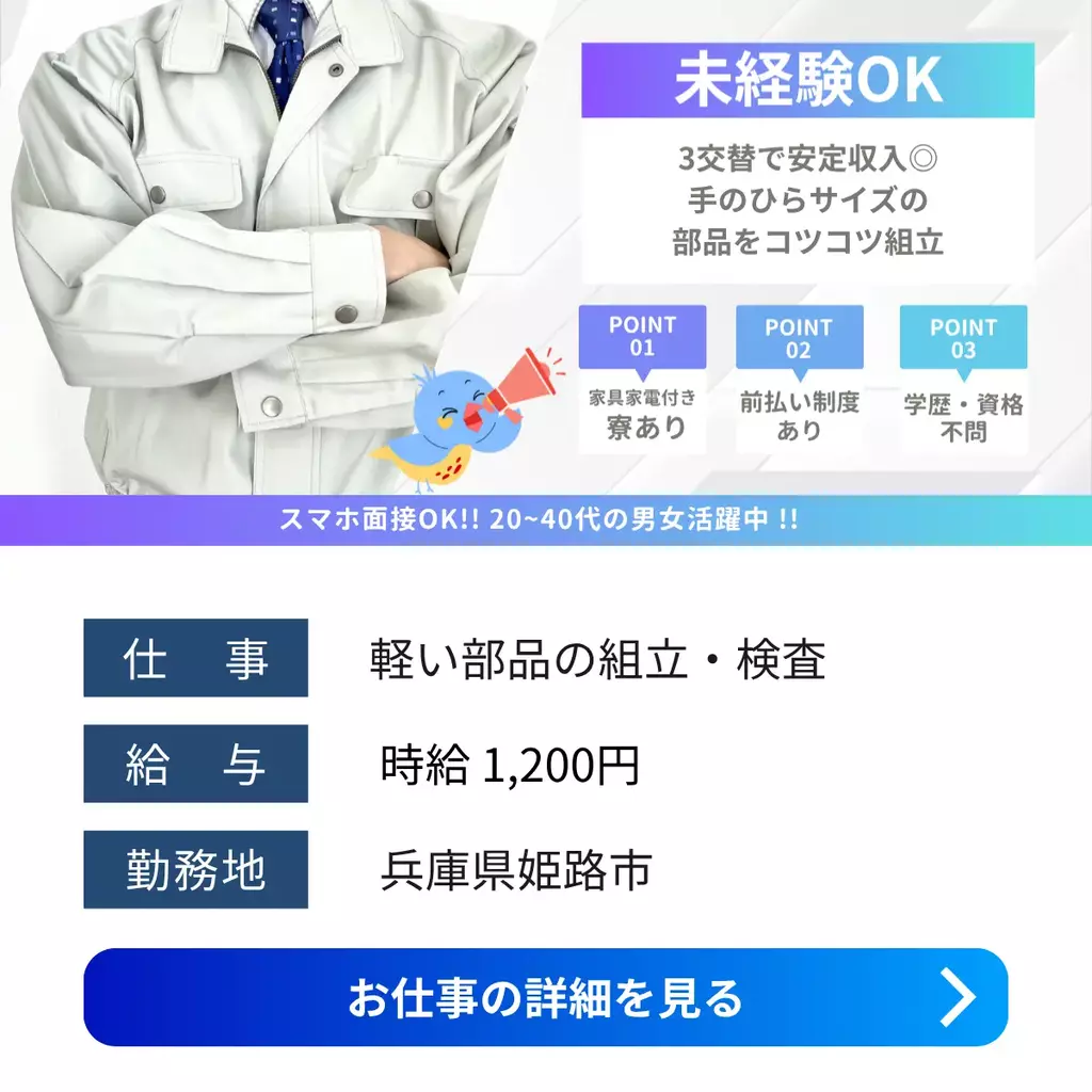 【姫路市】エアバッグ部品の組立・検査|未経験OK&月収27万円以上可能組立兵庫県運搬1200円以上機械オペレーター検査製造工場求人未経験者歓迎経験不問家族手当転勤なし交通費支給土日休み軽作業工場内作業資格不要社会保険派遣加古川オフィス姫路市2025-10-17 02:09