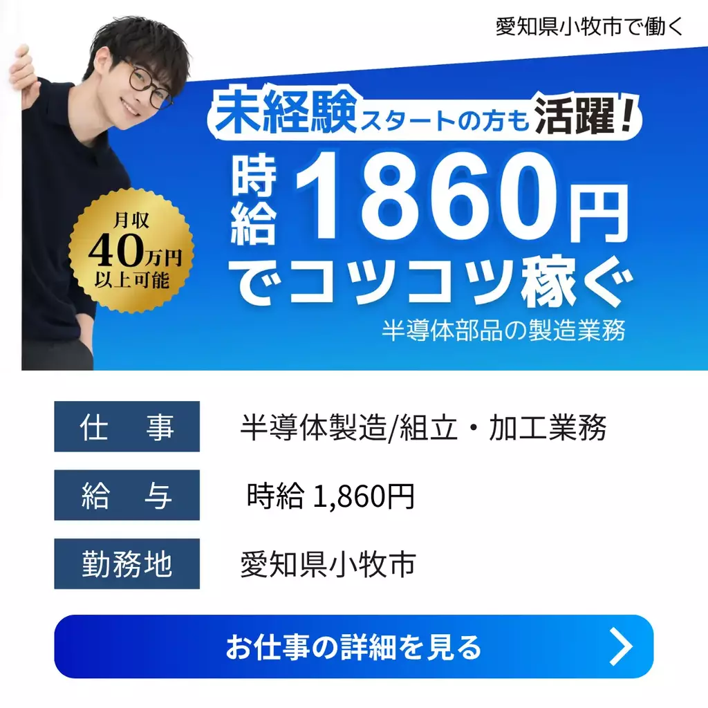 【愛知県小牧市】高収入×未経験歓迎!半導体製造装置メーカーでのお仕事【正確さ重視】組立加工愛知県1600円以上1500円以上1400円以上1300円以上1200円以上1800円以上1700円以上高時給製造工場1100円以上洗浄求人未経験者歓迎ブランクOK家族手当転勤なし交通費支給有給休暇土日休み夜勤工場内作業資格不要男性活躍中寮付き家電付き寮高収入住み込み春日井オフィス小牧市待機寮2025-03-18 05:47