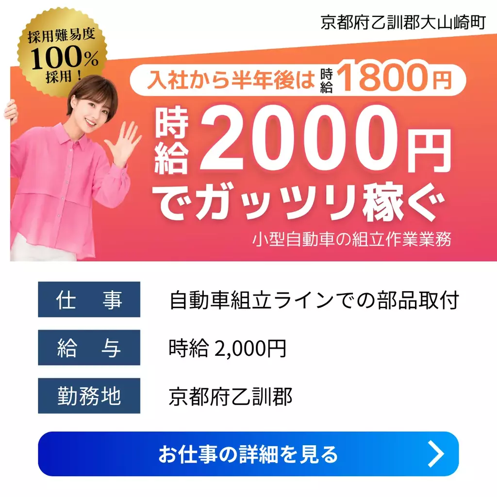 【京都府乙訓郡大山崎町】時給2000円/自動車組立ラインでの部品取付未経験/手当あり/寮費無料組立寮費無料京都府1600円以上1500円以上1400円以上1300円以上1200円以上1800円以上1700円以上寮費補助高時給製造工場1100円以上1900円以上求人入寮未経験者歓迎経験不問家族手当交通費支給有給休暇土日休み工場内作業資格不要社会保険住宅手当派遣高収入大阪オフィス乙訓郡待機寮2025-03-18 01:28