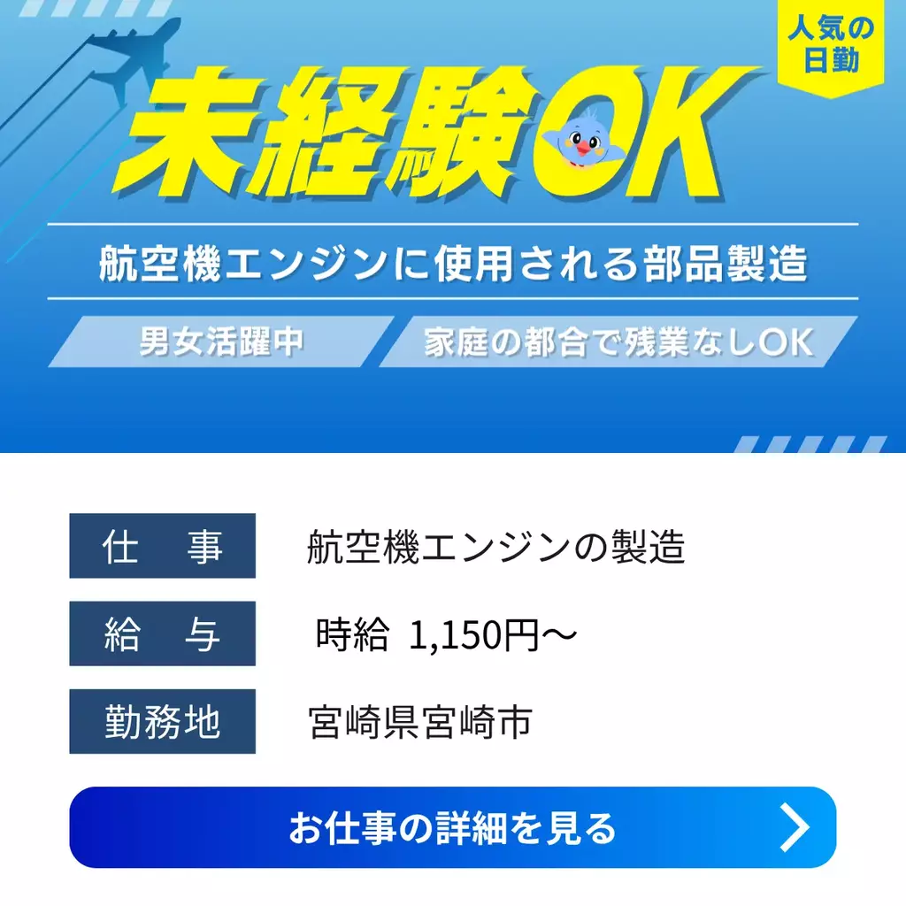 【宮崎県宮崎市】航空機部品製造スタッフ募集|未経験歓迎・土日祝休み運搬検査製造工場1100円以上求人宮崎県シニア活躍中未経験者歓迎中高年経験不問経験者歓迎シフト制家族手当転勤なし交通費支給昼勤(日勤)軽作業工場内作業社員食堂あり資格不要土日祝休み社会保険主婦・主夫歓迎女性活躍中男性活躍中派遣1000円以上宮崎オフィス宮崎市2025-01-23 00:39