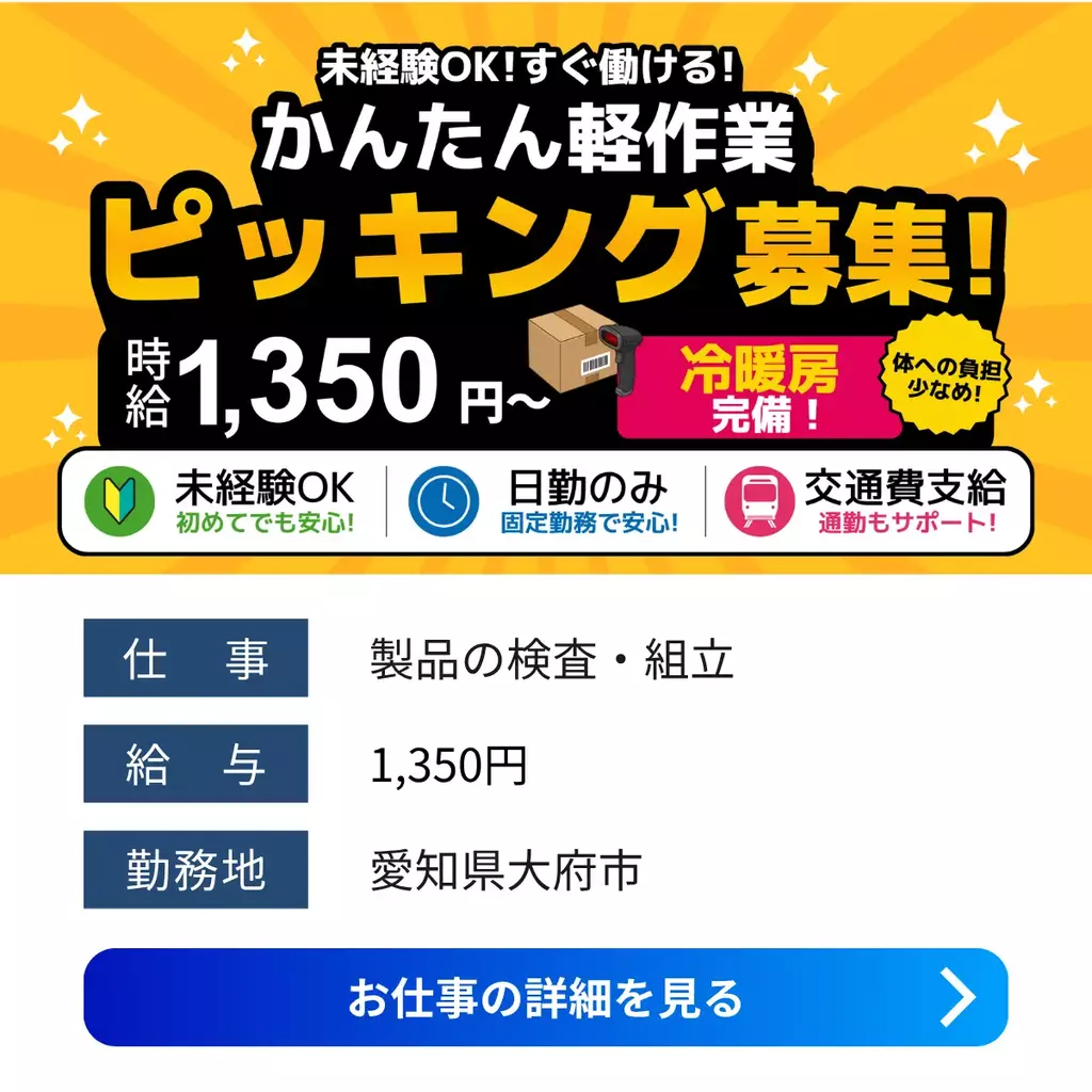 【愛知県瀬戸市】軽作業・組立|時給1300円+皆勤手当あり組立愛知県1300円以上1200円以上手当有製造工場1100円以上求人シニア活躍中未経験者歓迎経験不問家族手当交通費支給有給休暇昼勤(日勤)軽作業工場内作業資格不要土日祝休み社会保険女性活躍中男性活躍中寮付き家電付き寮派遣春日井オフィス瀬戸市待機寮2025-03-18 01:32