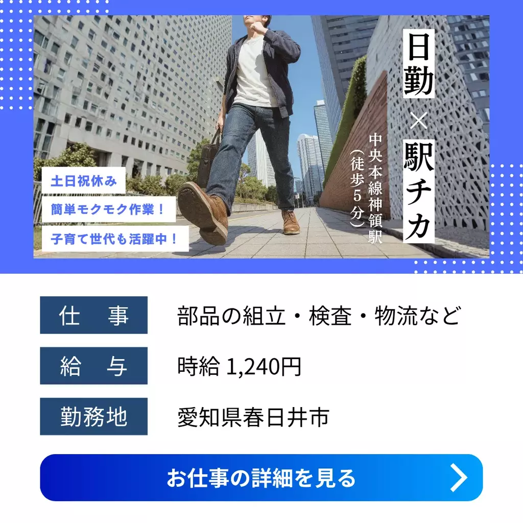 【愛知県春日井市】日勤×土日祝休み!プラスチック製品の組立・検査|未経験歓迎組立愛知県1200円以上検査工場1100円以上求人未経験者歓迎経験者歓迎家族手当転勤なし昼勤(日勤)資格不要土日祝休み社会保険派遣春日井オフィス春日井市2025-10-03 05:29