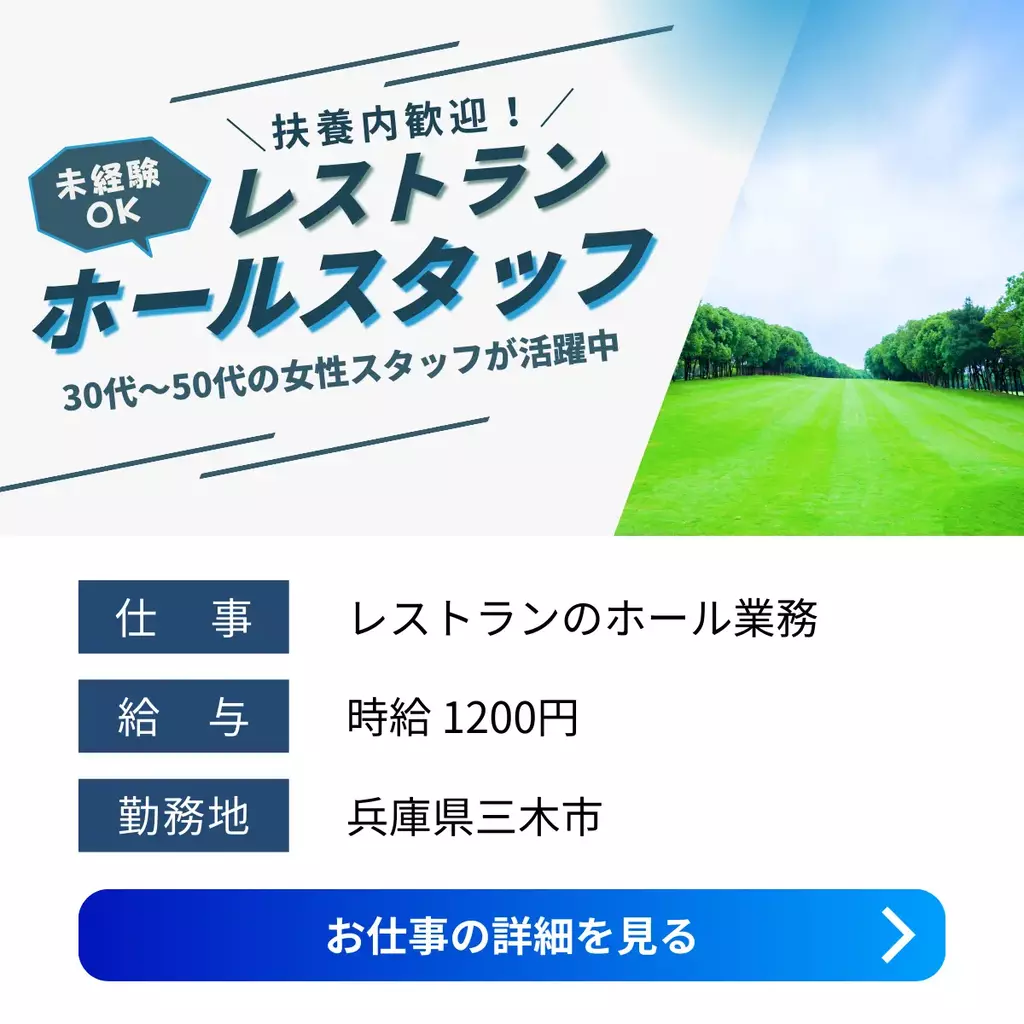 【兵庫県三木市】週2日~OKのゴルフ場レストランホール求人|扶養内・未経験歓迎兵庫県接客1200円以上求人シニア活躍中未経験者歓迎中高年経験不問家族手当交通費支給有給休暇昼勤(日勤)資格不要社会保険残業なし・少なめ主婦・主夫歓迎女性活躍中派遣加古川オフィス三木市2025-12-01 02:25