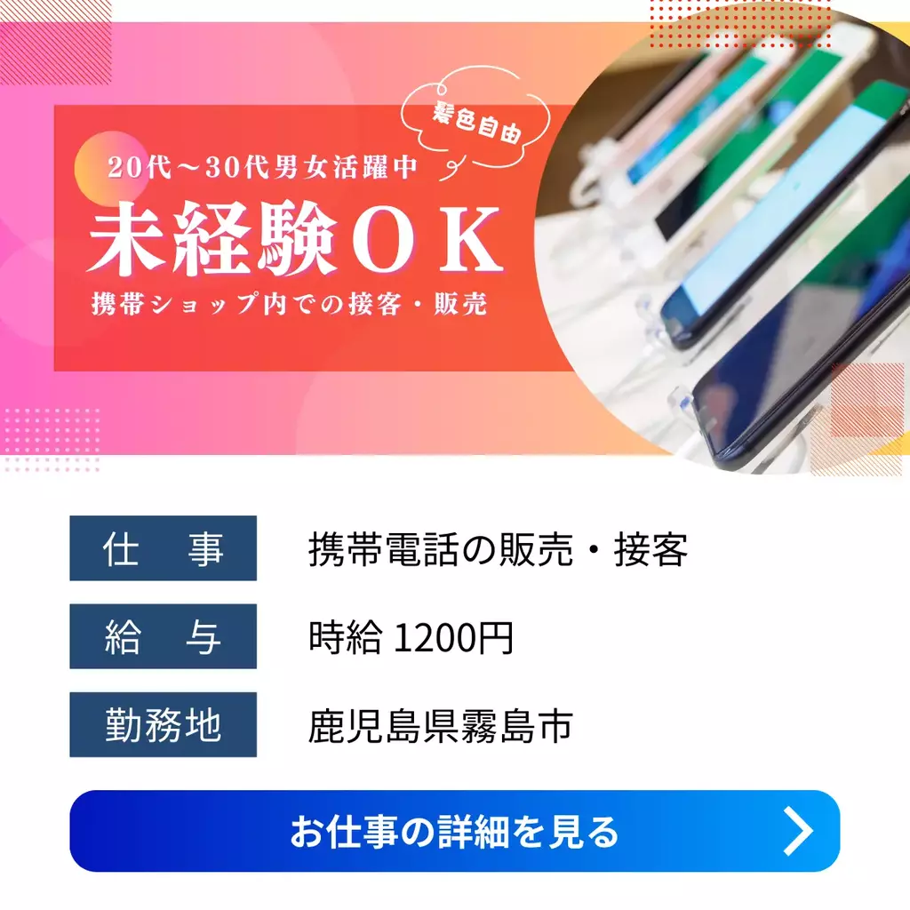 【鹿児島県霧島市】携帯ショップ接客スタッフ|髪色自由・高時給・シフト制|未経験歓迎接客1200円以上求人未経験者歓迎経験不問シフト制家族手当交通費支給昼勤(日勤)資格不要社会保険主婦・主夫歓迎女性活躍中男性活躍中派遣鹿児島県鹿児島オフィス霧島市2025-12-01 07:45