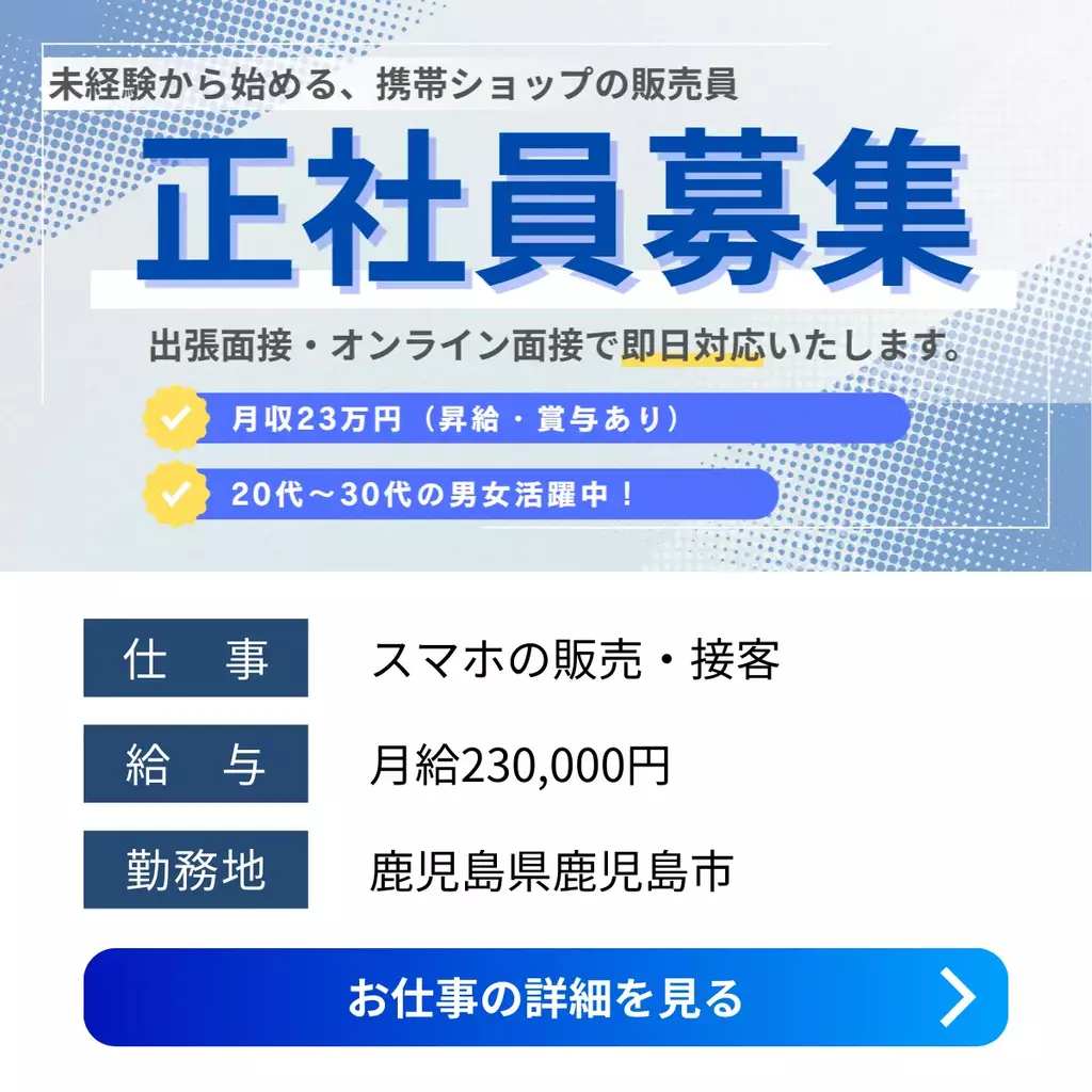【鹿児島県鹿児島市】携帯ショップ接客スタッフ|未経験OK・月給23万円接客正社員登用制度求人未経験者歓迎経験不問ブランクOKシフト制家族手当交通費支給有給休暇昼勤(日勤)資格不要社会保険住宅手当主婦・主夫歓迎女性活躍中男性活躍中派遣鹿児島県賞与鹿児島オフィス伊佐市薩摩川内市鹿児島市出水市霧島市鹿屋市枕崎市指宿市2025-12-03 01:42