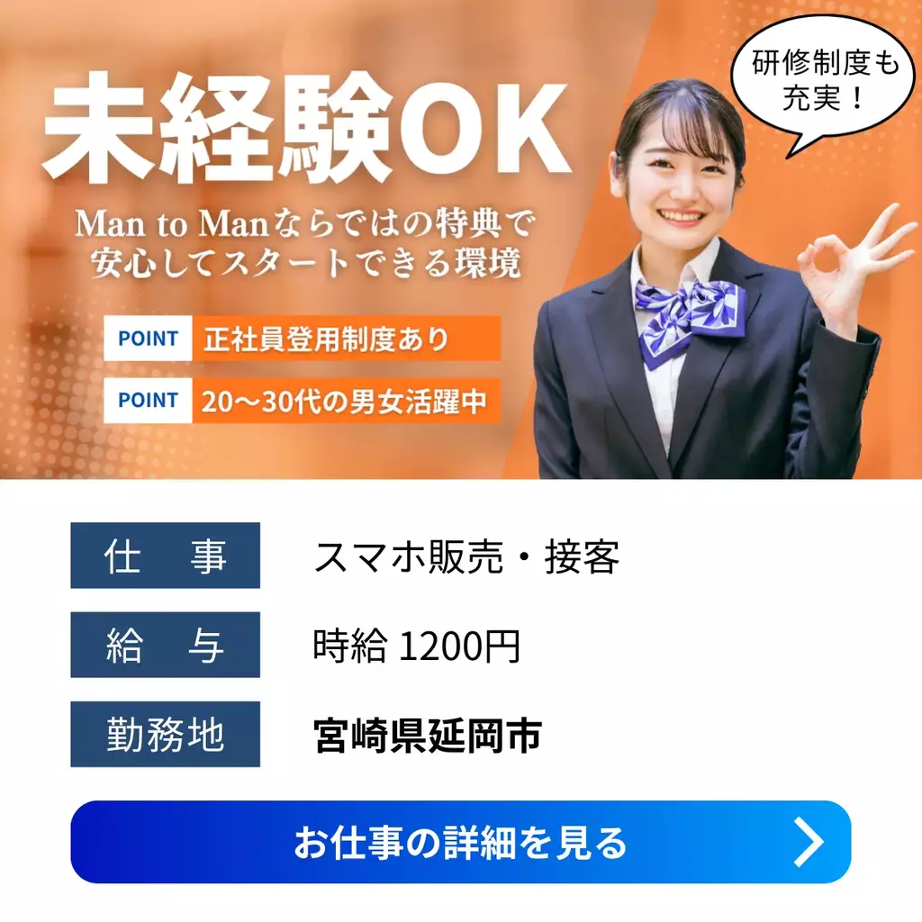 【宮崎県延岡市】携帯ショップスタッフ|未経験可・正社員登用ありの安定求人接客1200円以上正社員登用制度求人宮崎県未経験者歓迎経験不問ブランクOKシフト制家族手当交通費支給有給休暇昼勤(日勤)資格不要社会保険主婦・主夫歓迎女性活躍中男性活躍中派遣宮崎オフィス延岡市2025-12-03 02:45