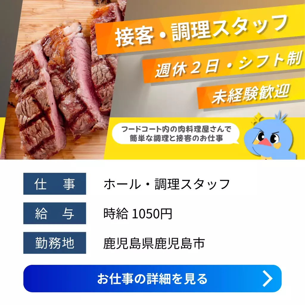 【鹿児島県鹿児島市】フードコートスタッフ募集|未経験歓迎・接客・調理のお仕事接客求人未経験者歓迎経験不問ブランクOKシフト制家族手当交通費支給昼勤(日勤)社会保険残業なし・少なめ主婦・主夫歓迎女性活躍中男性活躍中派遣1000円以上鹿児島県鹿児島オフィス鹿児島市2025-12-03 06:10