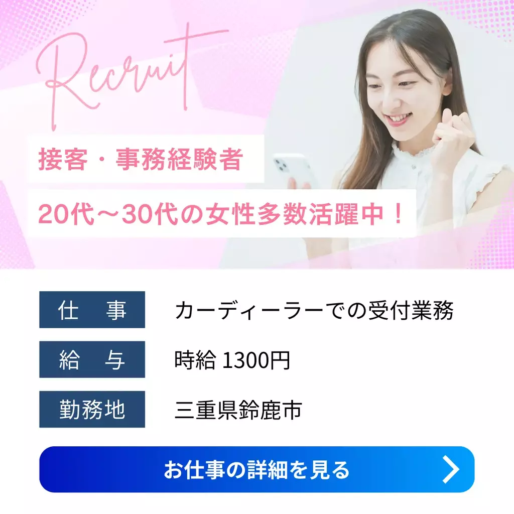 【三重県鈴鹿市】受付事務|未経験歓迎・データ入力・来客対応|時給1300円三重県接客1300円以上1200円以上正社員登用制度求人事務鈴鹿市未経験者歓迎経験不問経験者歓迎家族手当交通費支給有給休暇昼勤(日勤)社会保険主婦・主夫歓迎女性活躍中派遣四日市オフィス2025-12-03 06:43