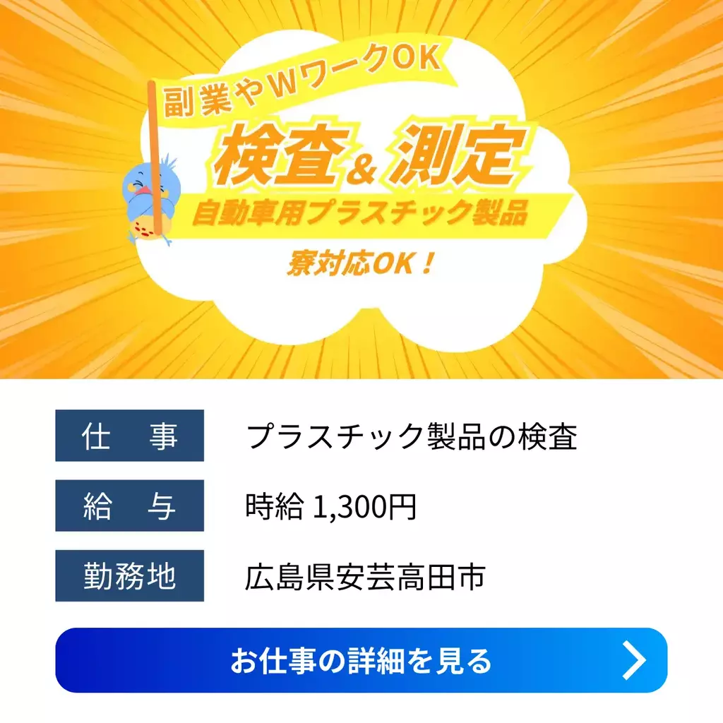 【広島県安芸高田市】プラスチック製品の検査・測定スタッフ募集|日勤×土日休み×副業OK1300円以上1200円以上検査製造工場広島県求人経験不問家族手当転勤なし土日休み社会保険寮付き家電付き寮派遣広島オフィス安芸高田市2026-01-06 06:39