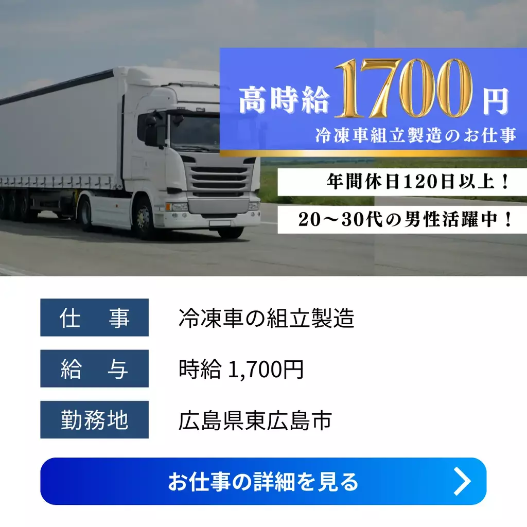 【広島県東広島市】冷凍車コンテナ製造スタッフ募集|日勤×高時給1700円×年休120日以上組立1600円以上1500円以上1400円以上1300円以上1200円以上1700円以上検査高時給製造工場広島県求人東広島市未経験者歓迎経験不問経験者歓迎ブランクOK家族手当転勤なし資格不要社会保険男性活躍中寮付き派遣高収入広島オフィス待機寮2026-01-07 04:32