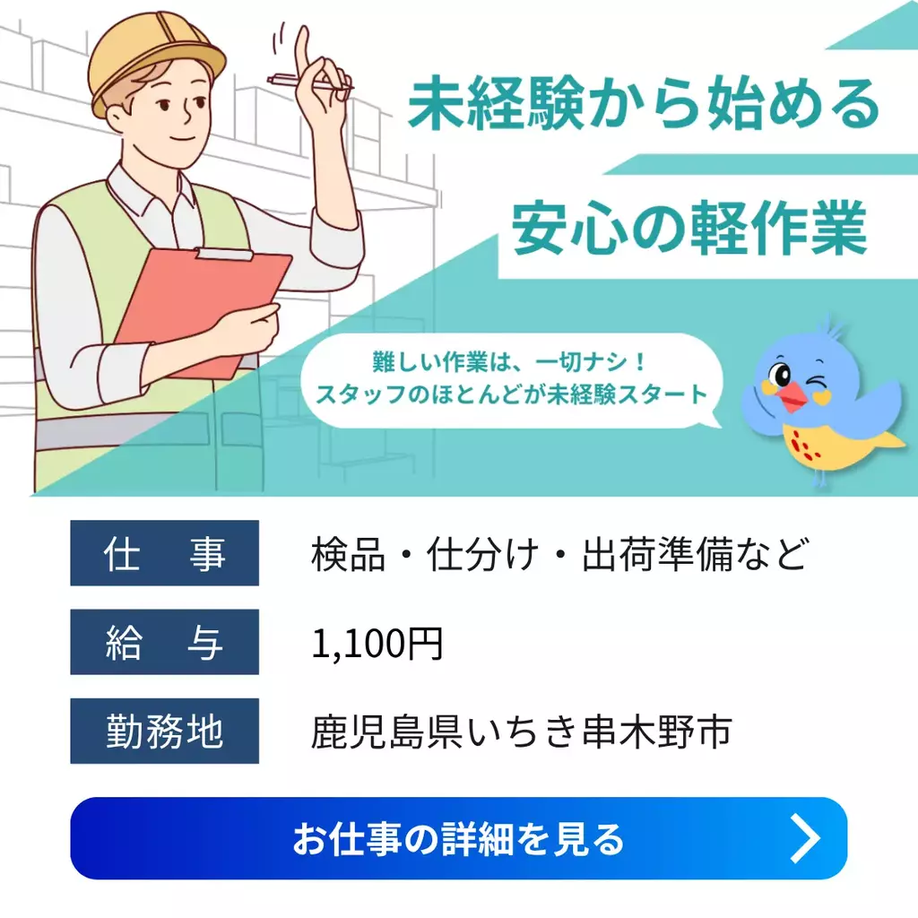 【鹿児島県いちき串木野市】倉庫内作業|未経験OK|交通費支給|退職金制度あり手当有検査工場求人シニア活躍中未経験者歓迎中高年経験不問経験者歓迎ブランクOK家族手当転勤なし交通費支給有給休暇工場内作業資格不要土日祝休み社会保険残業なし・少なめ女性活躍中男性活躍中派遣1000円以上鹿児島県友達と働く鹿児島オフィスいちき串木野市2025-03-18 04:32